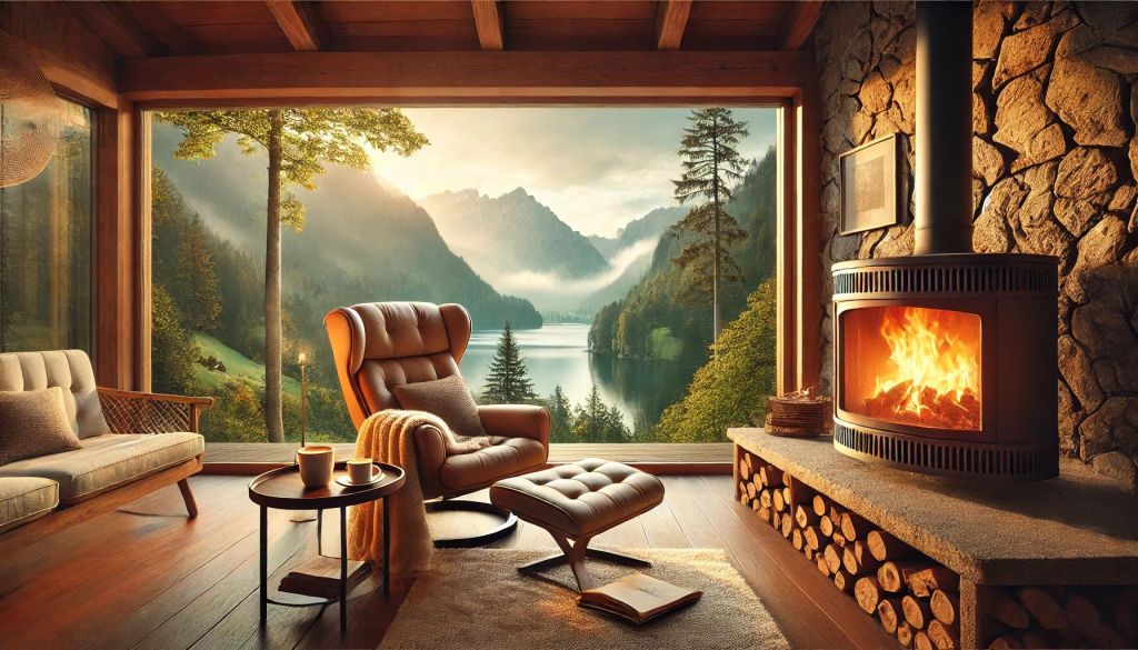 An open fire crackling softly, filling the room with warmth and that unmistakable scent of wood burning.